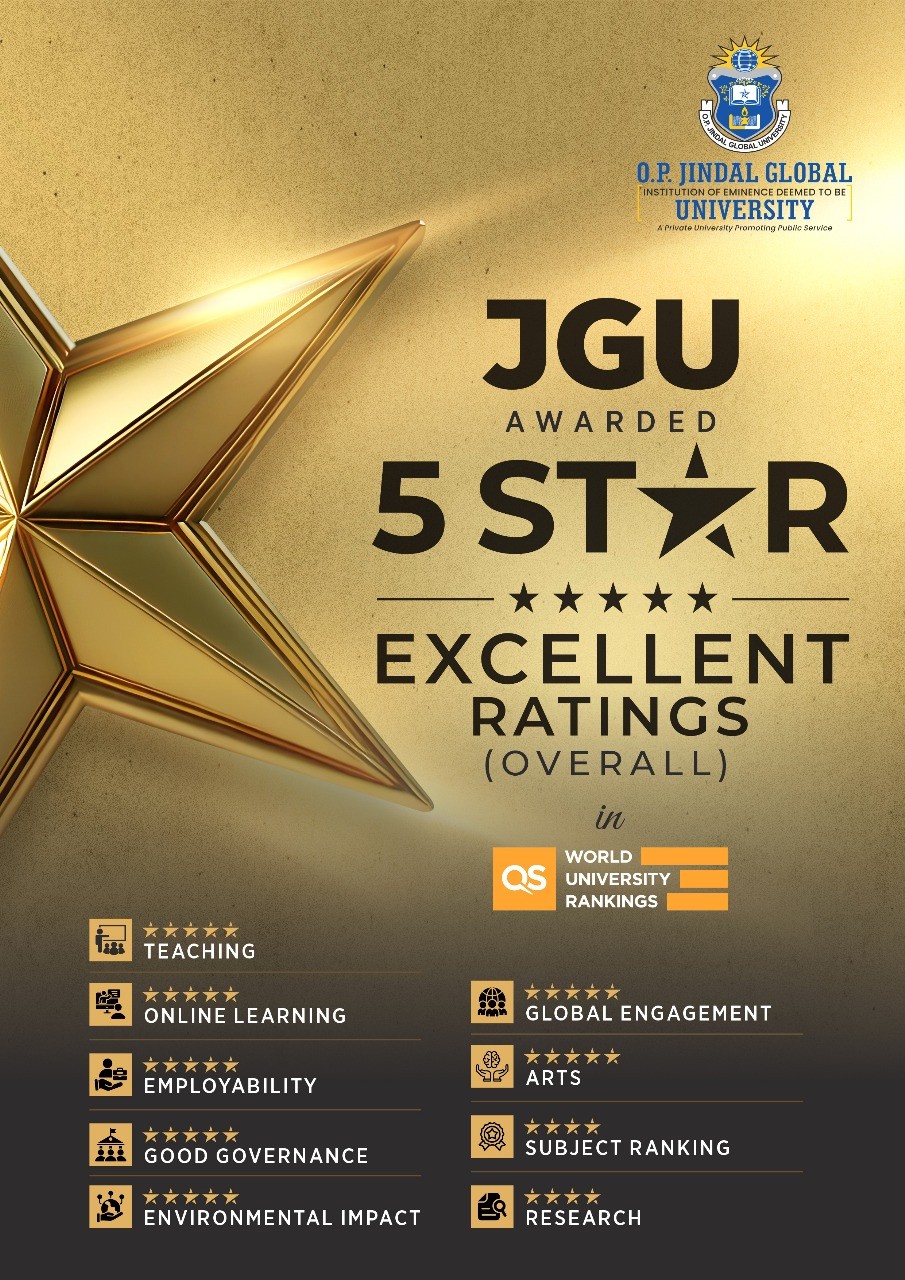 O.P. Jindal Global University (JGU) participated in the QS Stars Ratings 2025 – a global system that evaluates universities across multiple dimensions of teaching, research, employability, governance, sustainability and more – and JGU has been awarded an overall 5-Star Excellent Rating.